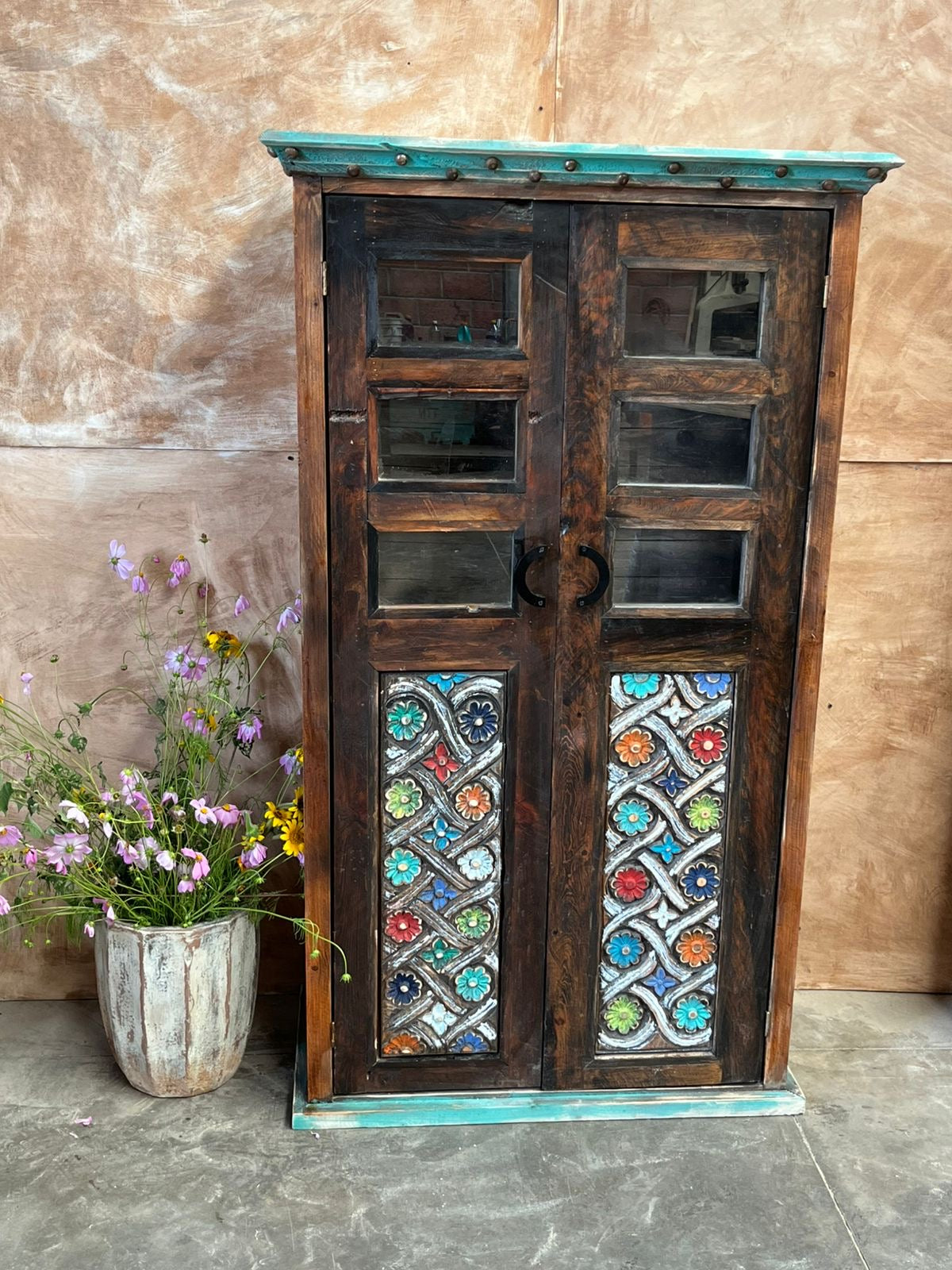 El Armario Penélope es una pieza artesanal única, elaborada en madera maciza y decorada con un hermoso relieve de flores talladas a mano.