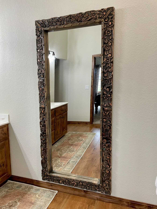 Espejo Oralia artesanal de 190 x 75 cm con marco rústico tallado a mano. Perfecto para darle un toque cálido y auténtico a tu hogar. Hecho en San Miguel de Allende.